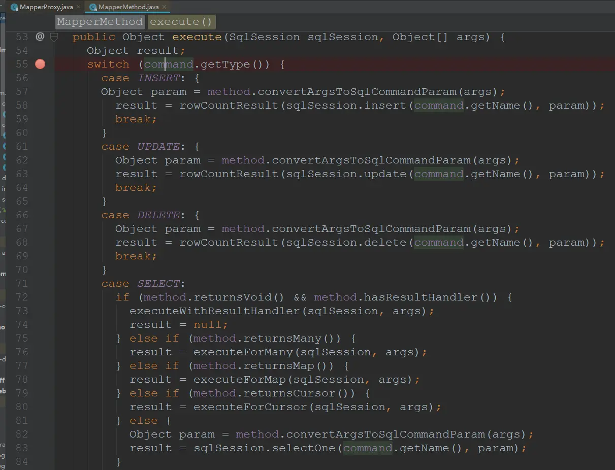 - MapperMethod执行execute时,就是根据前面创建的SqlCommand和MethodSignature的一些属性执行不同的操作,这些操作都调用了SqlSession接口。比如:xml中的select语句,SqlCommand中type指定为SELECT,execute根据不同type执行不同方法。xml中返回类型是单条记录,还是多条记录。分别对应MethodSignature的不同属性,然后执行不同的方法。