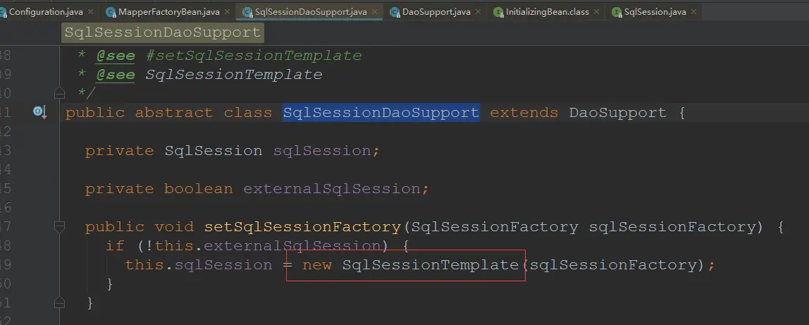 - session对象是MapperFactoryBean的父类SqlSessionDaoSupport的属性,内部具体实现类是SqlSessionTemplate