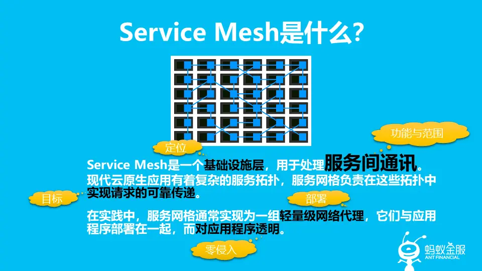 当然,今天我们的内容不是继续做 Service Mesh 的布道,按秀涛的要求,今年要好好讲一讲实践。所以今天我不会像去年那样给大家详细解释 Service Mesh 是什么,能做什么,有什么优势。而是结合过去一年中蚂蚁金服的实践经验,结合蚂蚁金服的 SOFAMesh 产品,帮助大家更深刻的理解 Service Mesh 技术。