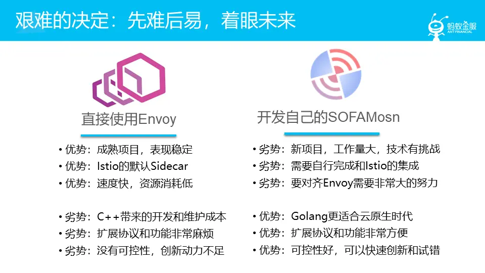 - Golang 还是更适合云原生时代,选择 Golang,除了做 Sidecar,锻炼出来的团队还可以用 Golang 去完成其他各种产品。当然选择 Envoy 也可以这么干,但是这样一来以后系统中就真的都是c++的产品了。