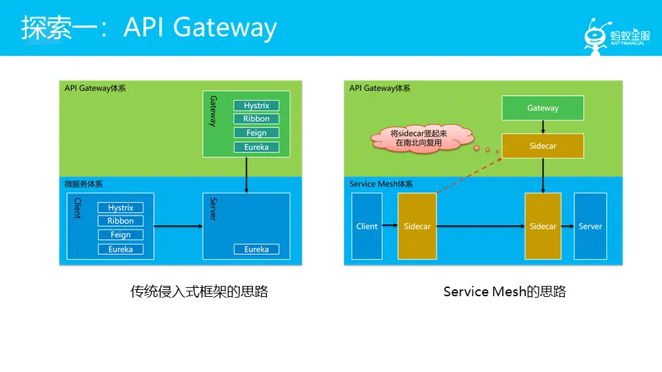 传统侵入式框架下,重用这些能力的方式是基于类库方式,也就是在 API Gateway 的实现中,典型如 Zuul,引入东西向通讯中的类库。而 Service Mesh下,思路有所不同,重用的不再是类库,而是 Sidecar:通过将 Sidecar 用于南北向通讯,重用 Sidecar 的请求转发和服务治理功能。