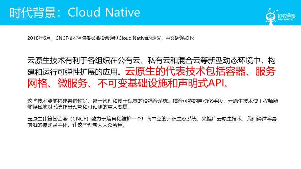 里面有一个时代背景:Cloud Native,云原生。而在今年6月,CNCF 技术监督委员会通过了 Cloud Native 的定义,中文翻译如上。
