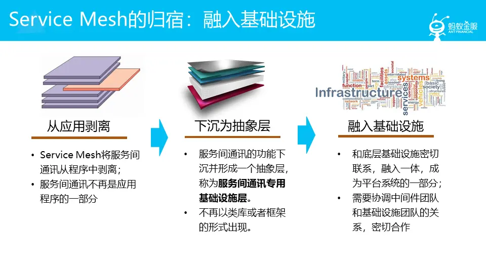 对于 Service Mesh,我们有一个重要判断,这也是今天最想和大家分享的一点:Service Mesh 的归宿,或者说最终的形态,是下沉到基础设施!