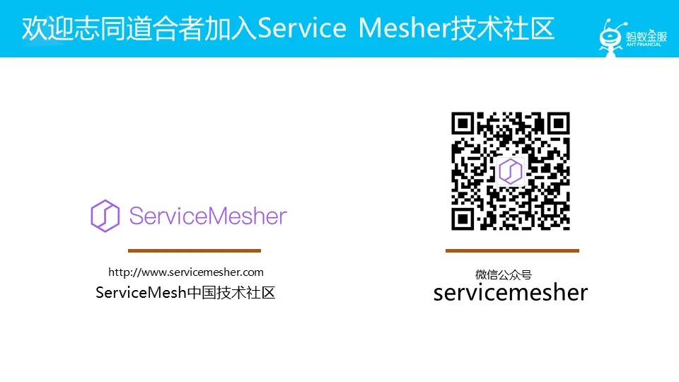 对 Service Mesh 技术感兴趣的同学,可以关注servicemesher社区,这是一个中立的纯技术社区,汇集了当前国内大部分 Service Mesh 的技术人员。我本人也是 servicemesher 社区的创始人之一,这个社区的使命是传播 Service Mesh 技术,加强行业内部交流,促进开源文化构建,推动 Service Mesh 在企业落地。