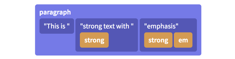 这种树状结构有趣的例外在于段落节点编纂文本的方式。考虑由以下句子组成的段落,“This is strong text with emphasis”。