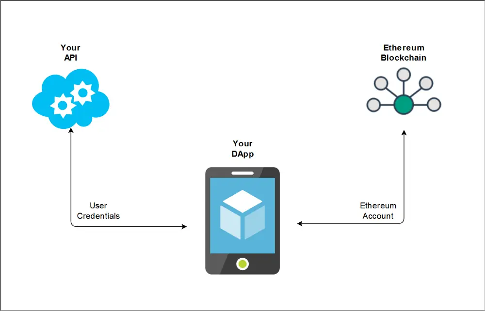 去中心化应用程序(DApp)的常见设计不仅依赖于以太坊区块链,还依赖于API层。在这种情况下,DApp通过用户的以太坊帐户与智能合约进行交互,并通过交换用户凭据而发布的JWT token与API层进行交互。