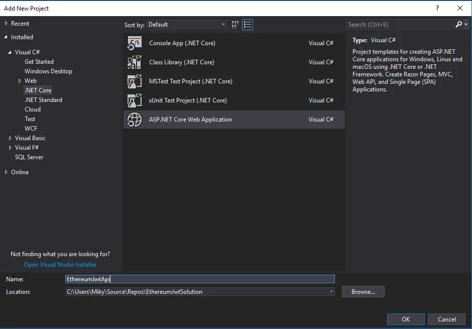 打开Visual Studio 2017,创建EthereumJwtSolution并添加两个Asp.Net Core 2 Web应用程序项目:EthereumJwtApi和EthereumJwtClient。为两个项目选择空项目脚手架。