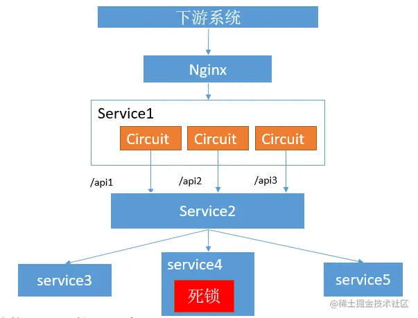 service4内的死锁导致api2失败了,最终触发熔断。service1将整个service2全部隔离了,导致一个小小的死锁,引发了系统快速失败。