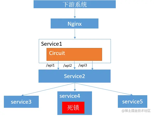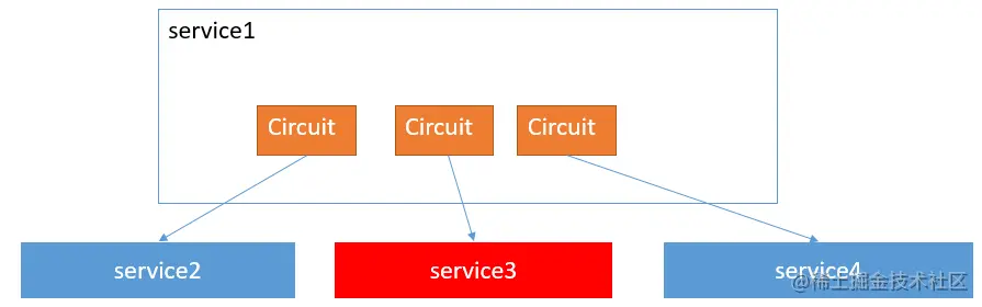 每个service内部会有多个circuit,每个circuit对应一个上游微服务。当service3出现问题时(如死锁,或是并发量太大),将物理进行隔绝,即不再发送任何请求,以保证系统健康,service1依然可以正常和2,4交互,保证大部分业务正常。