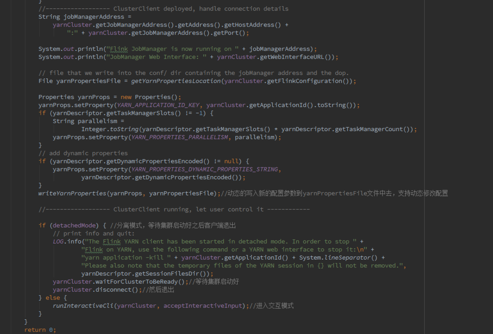 ** 这里主要为构造YarnClusterDescriptor,然后调用其deploy方法启动集群 ,接着将Jobmanager和web ui地址写入到out文件中去,如果采用分离模式,则等待集群启动之后yarn session自动退出,如果不是则进入交互模式,我们可以通过交互控制这个Applitcation **