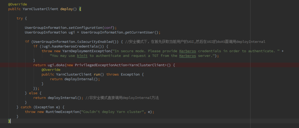 由于YarnClusterDescriptor没有重写depoy方法则直接调用其父类AbstractYarnClusterDescriptor的deploy方法,但是最终调用的是其deployInternal方法.