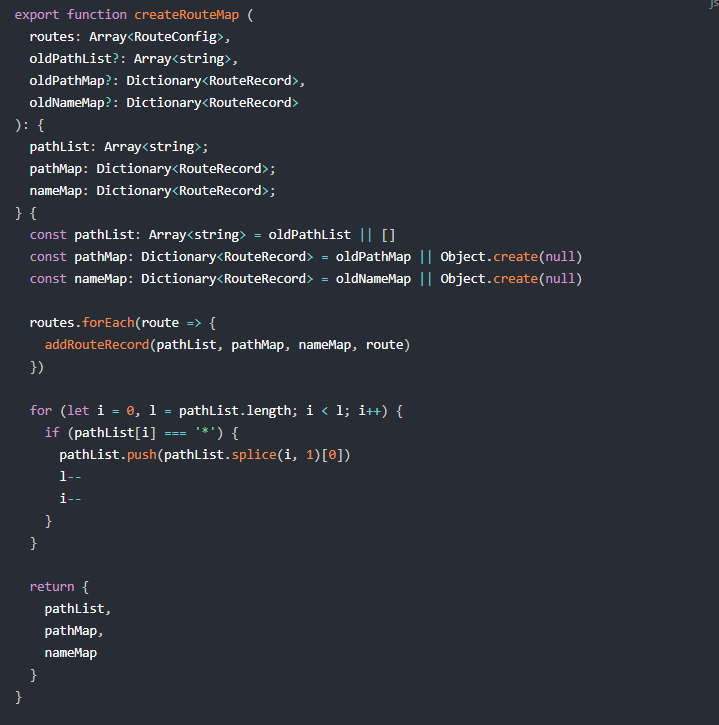 createRouteMap 函数的目标是把用户的路由配置转换成一张路由映射表。它的创建是通过遍历 routes 为每一个 route 执行 addRouteRecord 方法生成一条记录。