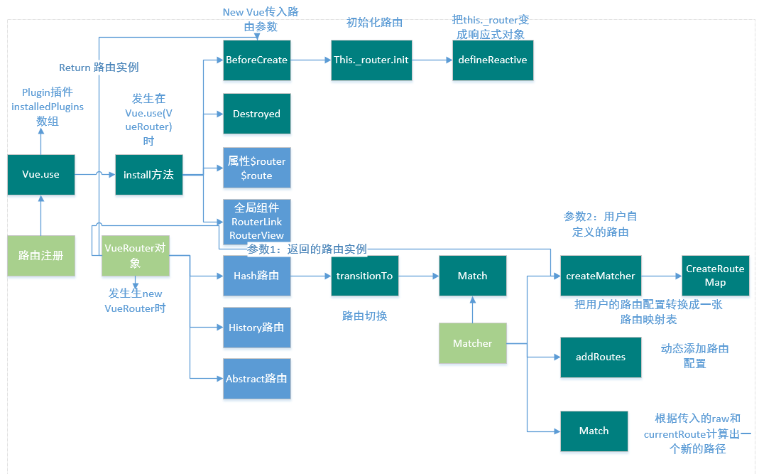 在Vue.use(VueRouter)阶段,调用Vue.use中的install方法进行路由安装。install方法中有两个钩子函数:beforeCreate和destroyed;另外install中还定义了router和route,这样使得可以在程序中访问this.$router和this.$route;install中还定义了两个全局的API,rootLink和rootView。
