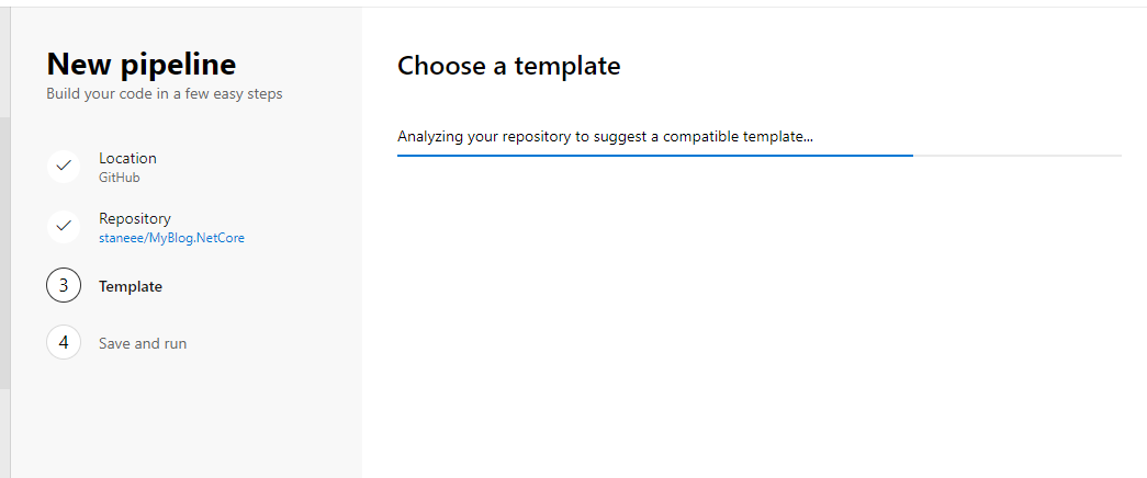 选择之后将会对你选择的仓库中的代码进行分析,会推荐给你 build的模板, 但是如果已经存在 azure-pipelines.yml 文件会直接跳过分析,进入下一步