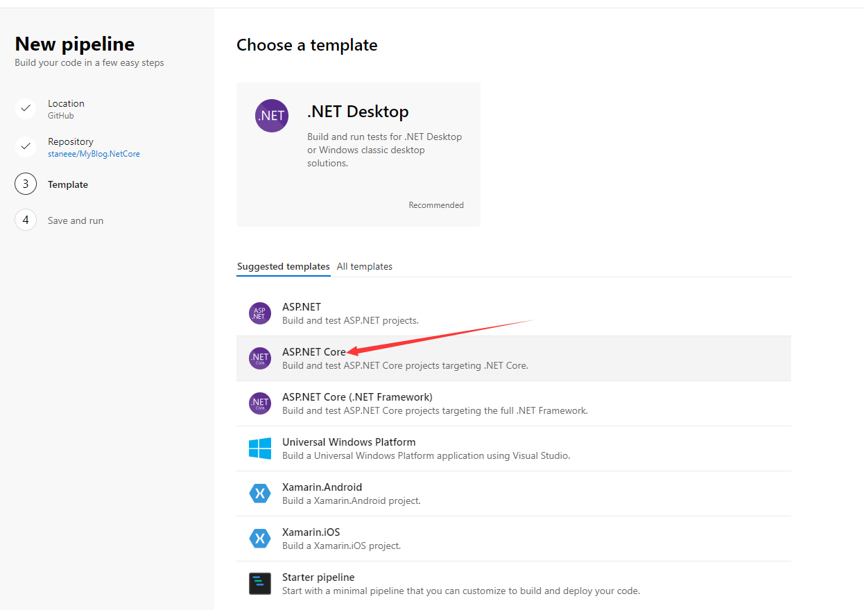 我这里是 ASP.NET Core 项目,所以直接选了 ASP.NET Core 模板
