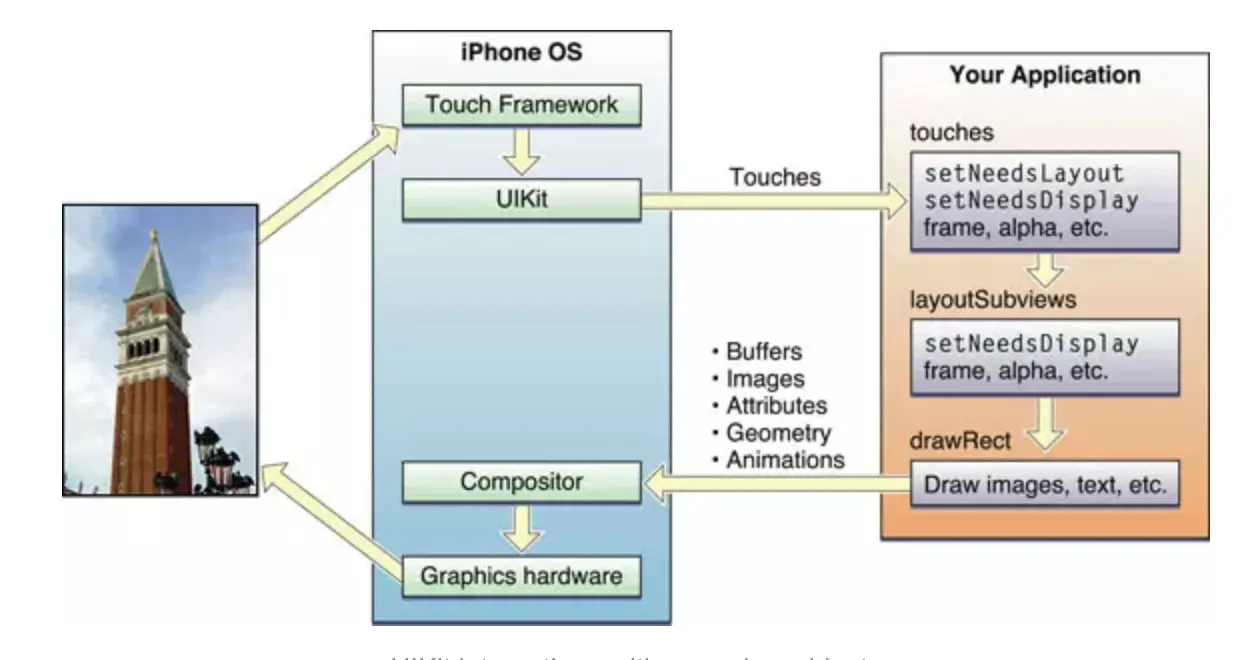 在Touches传递到了视图上的时候,会调整视图的UI属性,比如frame,透明度神马的;会被表示为setNeedsLayout;会被标识为setNeedsDisplay。