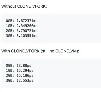 go1.9 增加了 CLONE_VFORK 和 CLONE_VM。只带 SIGCHILD 的 clone 可以认为类似于 fork(最后都是调用 do_fork), fork 的问题是,在父进程占用内存越大性能越差,具体可以看这个链接: