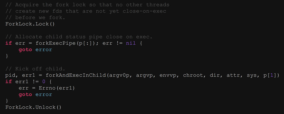 Linux 在 2.6.27 之后,打开文件或者管道,和设置 O_CLOEXEC 是一个原子操作,因此问题不大,但 golang 对内核版本的要求是 2.6.23 及以上,另外 Unix 系统中,open 和设置 O_CLOEXEC 是两个操作,如果在两个操作之间发生 fork, 子进程就可能继承它不需要的文件描述符,因此需要加锁。重点看下 forkExec 时候的源代码: