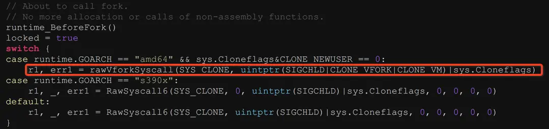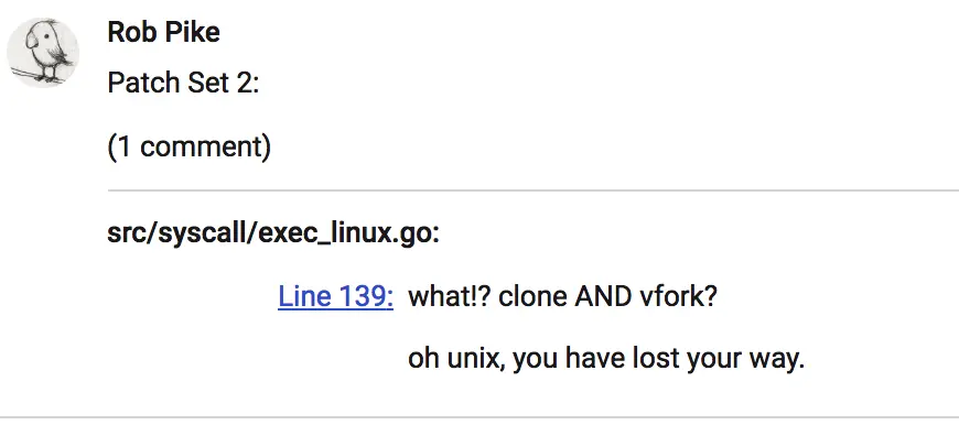 正因为 vfork 的使用需要小心,因此 go1.9 准备加入 vfork 发布之前,有人提出代码不够健壮,因为 rawVforkSyscall 返回之后,在父进程段还执行指令,这样子进程有机会破坏双方的共享栈,因此提了一个 commit 去让 rawVforkSyscall 在返回后,在父进程段什么都不做直接 return,解决这个互相影响,如图所示: