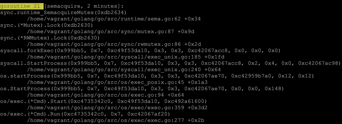 从问题的现象看,肯定是某 goroutine 在 forkExecPipe 或者 forkAndExecInChild 这两步卡住了,锁没释放,因此有些 goroutine 一直拿不到锁,饥饿致死。forkExecPipe 最后调用的是内核 pipe2,forkAndExecInChild 最后调用的是内核 clone 和 exec。