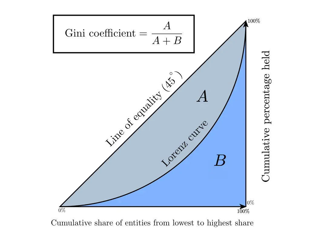 基尼系数的方程式可以由如下所示的洛伦兹曲线和所谓“绝对平等线(Line of equality)”以下区域计算得出: