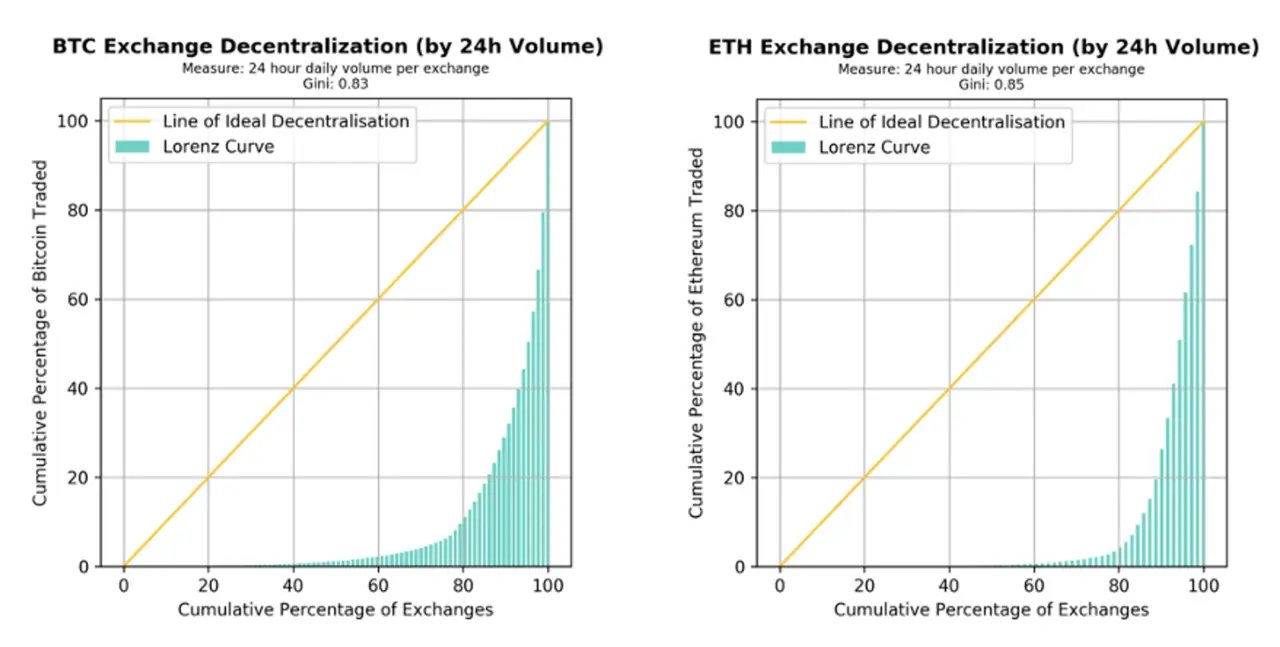 各个交易所比特币和以太坊的交易量差异很大,相应的基尼系数也是如此。然而,我们出于展示目的,在左下角的面板中计算了过去 24 小时的基尼系数快照。