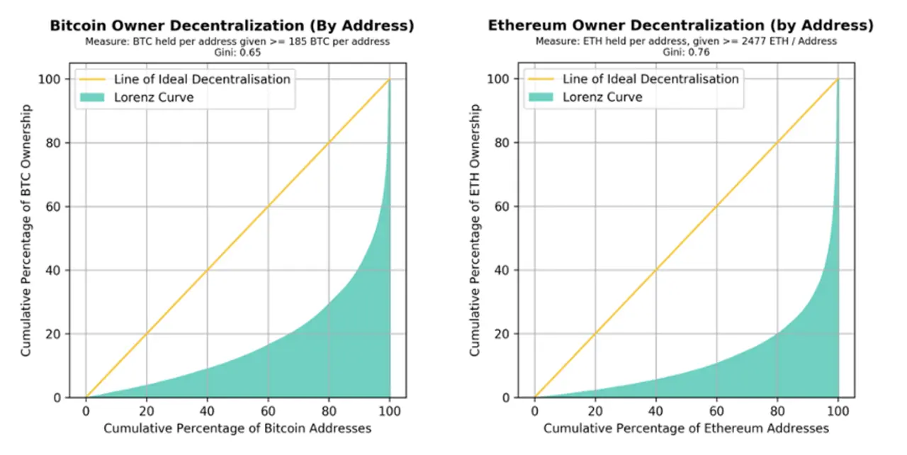 为了更好理解这个定义,我们首先交代有关基尼系数和洛伦兹曲线的相关概念的部分背景,然后根据这些衡量标准,展示一些图表和计算结果来看一看整个加密生态系统的去中心化现状。我们接着会讨论衡量去中心化的概念,作为对比特币和以太坊基本子系统的综合衡量方法。我们在结尾部分将最小中本聪系数定义为系统级去中心化的提议衡量方法,并且讨论改善这个系数的方式。
