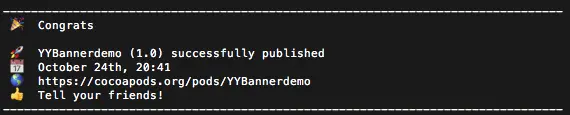 pod trunk mepod trunk register 1006228982@qq.com 'sdupidBoby' --verbose3. 注册Trunk账号,回车之后去打开邮箱的链接(需要copy,不能直接点击)即可完成pod trunk push YYBannerdemo.podspec --allow-warnings