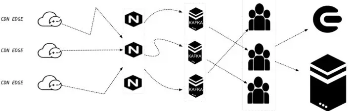 这些日志在边缘节点进行一定的缓冲后,通过公网上传到数据中心的日志服务代理层。因为 CDN 节点分布在全国和海外一些地区,如果每一个机房都到数据中心建传输网络,这个成本比较大,所以这里都是走公网传输。