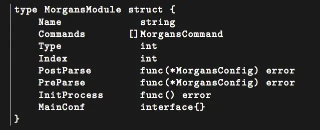 如上图,是 Morgans 前端的一个模块结构体,名字、配置项、类型,包括 PostParse 处理到某条配置文件指令时,某个模块的某个配置指令钩子会被调用,从而正确解析到该配置;配置文件解析完毕后,模块的 PostParse 钩子会被调用;准备开始工作时,模块的 InitProcess 钩子会被调用等。