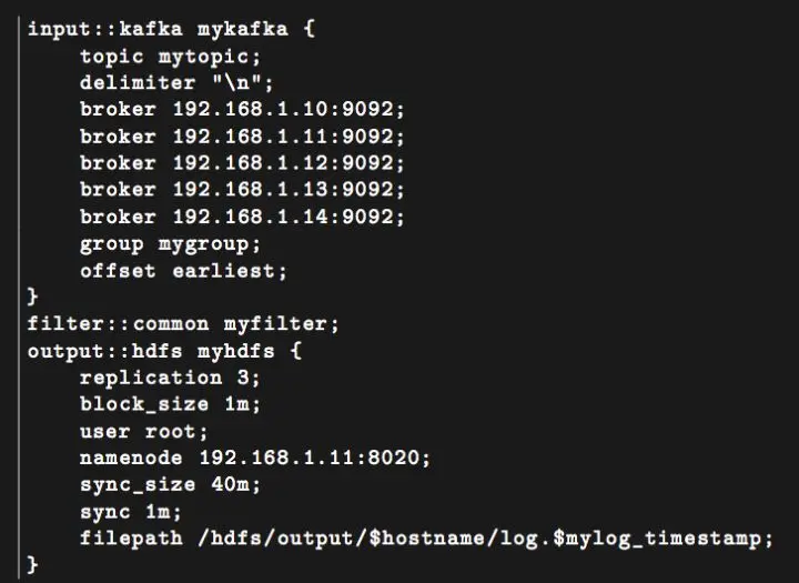 下面定义了一个 filter ,比如有一个 common 的过滤模块,随便给个名字,后面是 一个 hdfs output 模块,包括文件的 replication 属性、hdfs namenode 的地址、user等。在 filepath 里面, $hostname 、 $mylog_timestamp 称之为变量。整个 filepath 的配置利用到了变量插值的技术,即取出配置里的源字符串,转换为中间形态,使用的时候去解析,得到目标字符串。