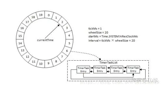 }这样,我们的时间总能落在0 - 59任意一个bucket上,就如同我们的秒钟总是落在0 - 59刻度上一样,这便是 时间轮的环形队列 。