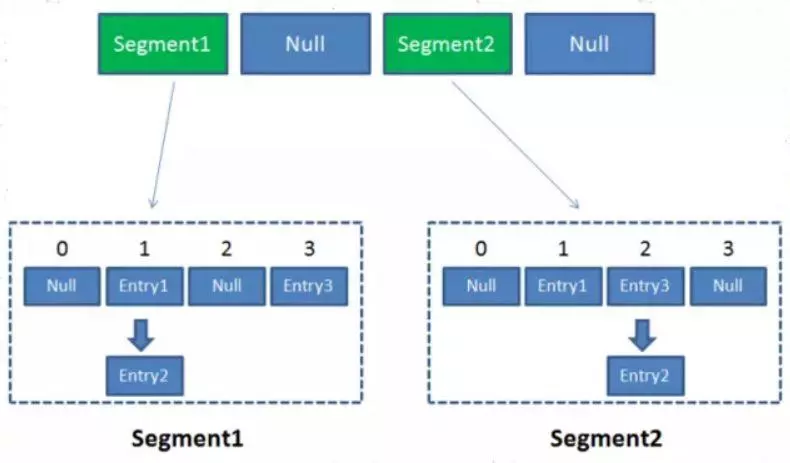 分段锁的设计目的是细化锁的粒度,当操作不需要更新整个数组的时候,就仅仅针对数组中的一部分行加锁操作。