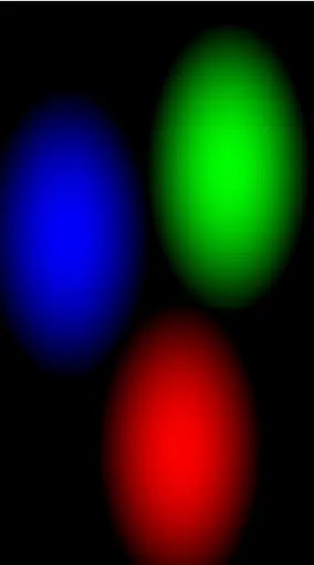 图中就是我们要实现的效果,有红蓝绿三种颜色的圆圈在旋转,我们需要解决的主要问题有如何使用webgl来画一个模糊的圆圈,如何使三个圆圈绕一点旋转。