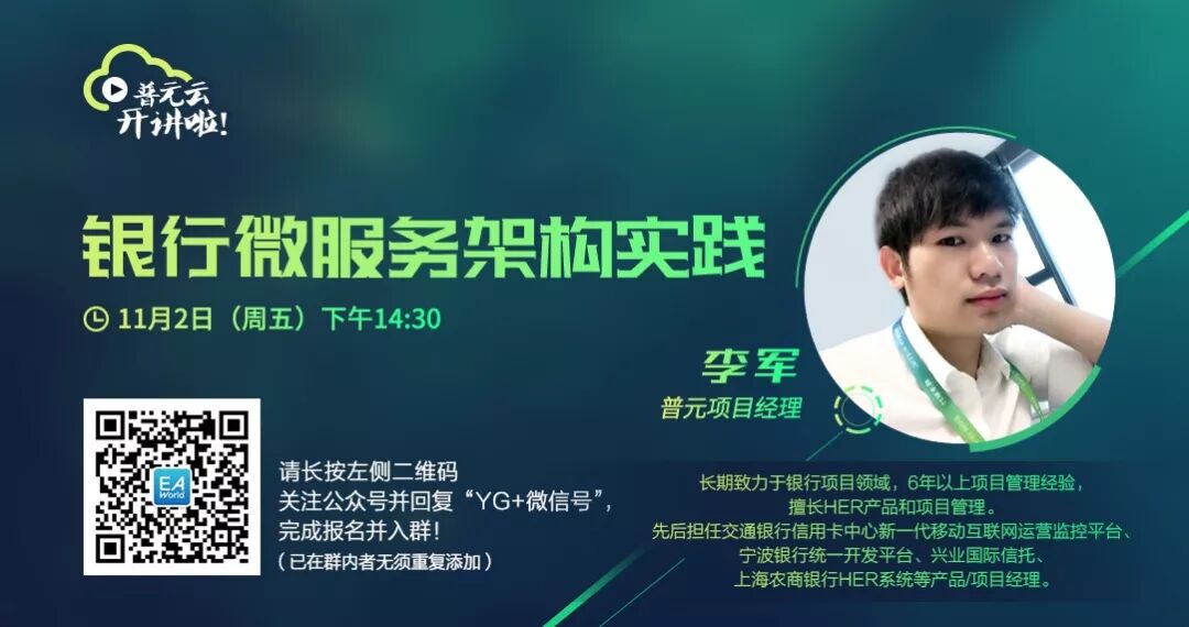 课程预告! 11月2日(周五)下午14:30普元项目经理李军为大家分享《银行微服务架构实践》,在此公众 号 回复“YG+微信号”马上入群并完成报名!