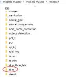 解压之后,将其中\models-master\research路径下的slim文件夹(如图1),复制到本地代码的同级路径下。