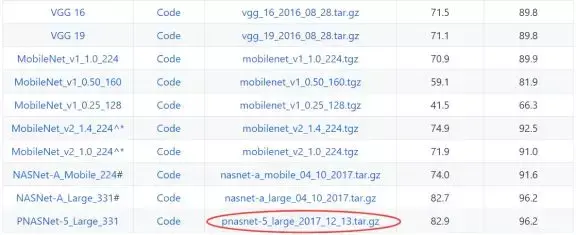 图2 PNASNet模型下载页面