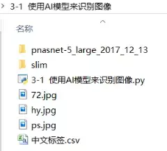 由于本例中使用的PNASNet预训练模型是在ImgNet数据集上训练好的模型,在使用该模型分类是,还需要有与其对应的标签文件。slim中已经将获得标签文件的操作直接封装到了代码里,直接调用即可。由于标签文件是英文分类,读起来不太直观。这里提供了一个翻译好的中文标签分类文件“中文标签.csv”。也在书籍同步的配套资源中。