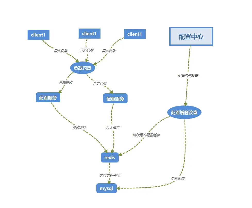 可以有一个配置中心,通过配置中心对每一条配置进行增删改查,配置最终以key-value储存在mysql数据库,配置对外服务,多机器部署,满足性能需要。应用直接去调用配置中心提供的接口查询配置,这样可能对数据库压力太大,这样的话可以在配置中心添加缓存,每次查询缓存,这样的话每次查询的时候,就不会调用数据库,每次可用直接查询缓存,每次更改配置的时候,顺便更改缓存,这样能保证可用性和一致性。