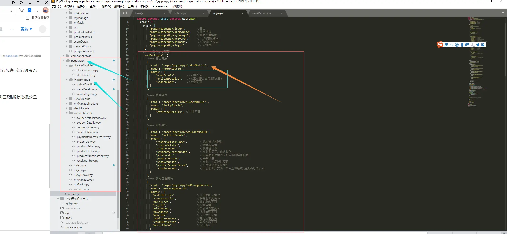 - subPackages:[] 分包配置,将模块页面放入,上面就可以不用配置了
