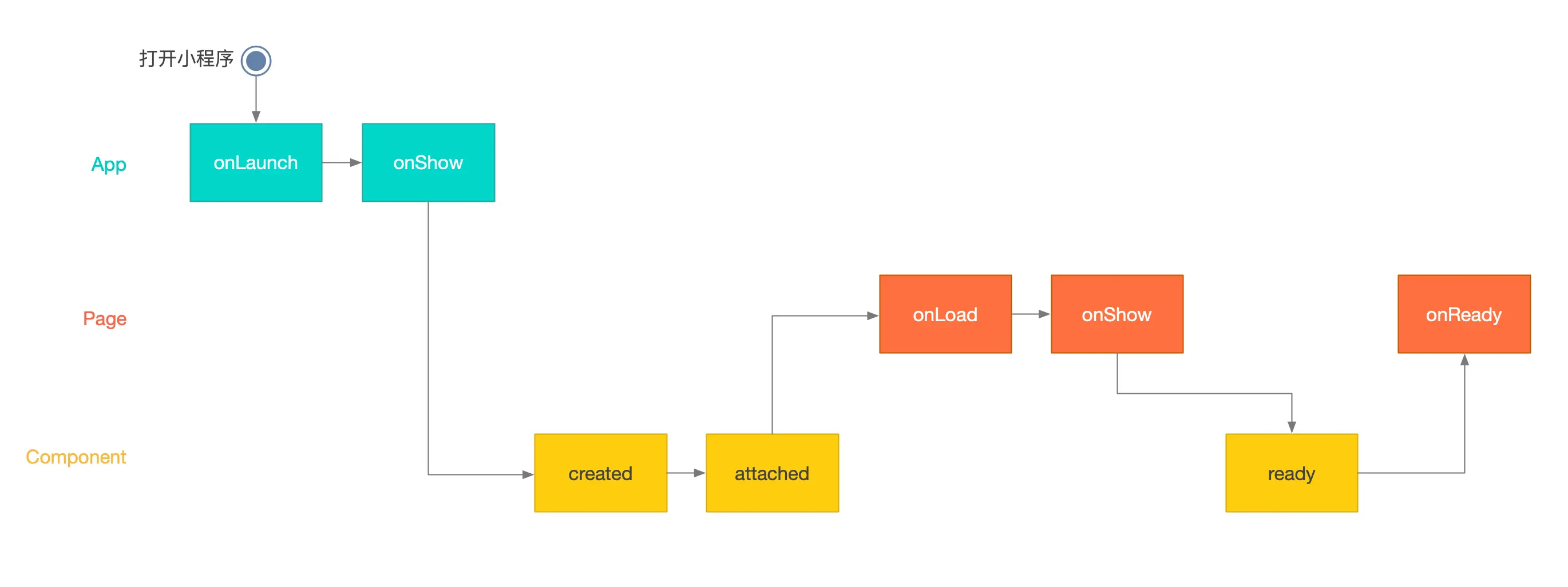 其中,打开小程序后会依次执行onLoad => onShow => onReady