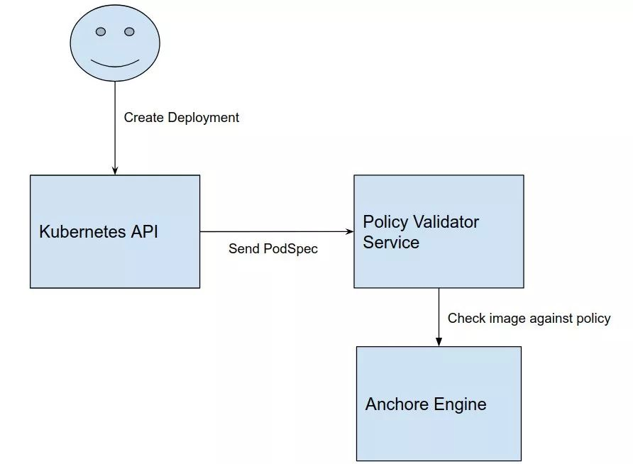 用户提交部署时,由Kubernetes通过调用Policy Validator服务来向Anchore Engine API发起镜像安全扫描,评估是否符合安全规则。不过,这样就无法在CI环节提前检测发现漏洞,而把漏洞留到了CD阶段,个人认为不是很好的设计。