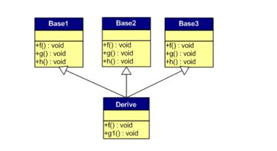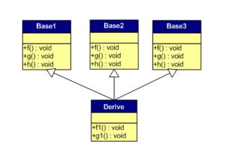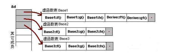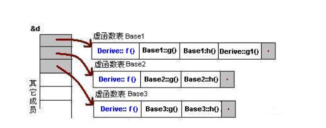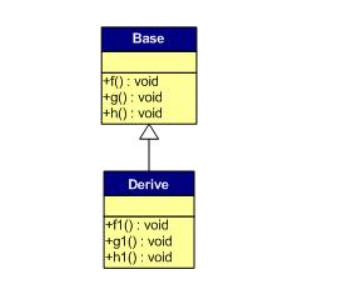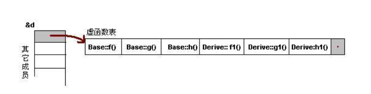 使用一个类型为Base的指针b指向一个新建的实例Derive(),此时对于指针b指向的虚函数表中,此时f()的地址被Devieive函数的地址被覆盖, 形成如上的虚函数表。