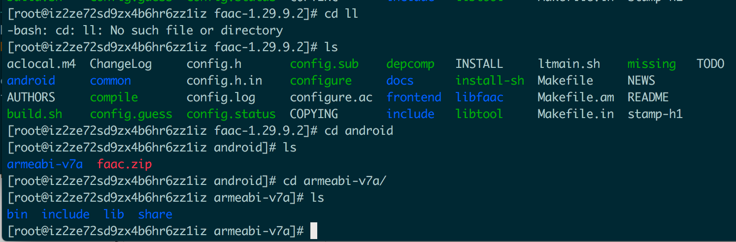 这里没有用Mac下编译,一直出错,改到云服务器上编译的。成功后会在 faac 的根目录下生成指定的文件夹:PREFIX=pwd/android/armeabi-v7a: