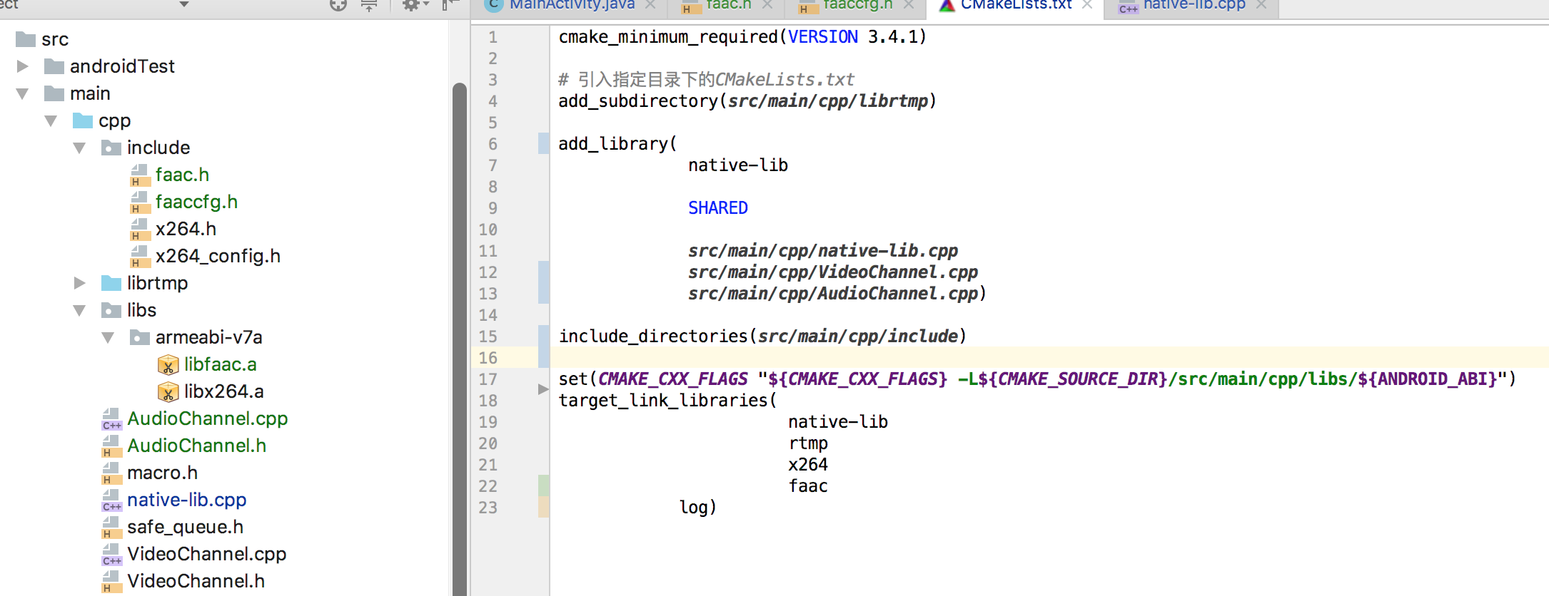拷贝include下的头文件,lib下的静态库到项目工程中去,修改CmakeList文件,然后进行编码推流