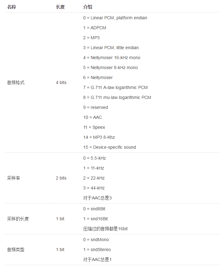 RTMP推流需要的是aac的裸数据。所以如果编码出adts格式的数据,需要去掉7个或者9个字节的adts头信息。类似于推送视频,第一个包总是包含sps和pps的音频序列包,推送音频同样第一个包是包含了接下来数据的格式的音频序列包,第一个字节定义如下: