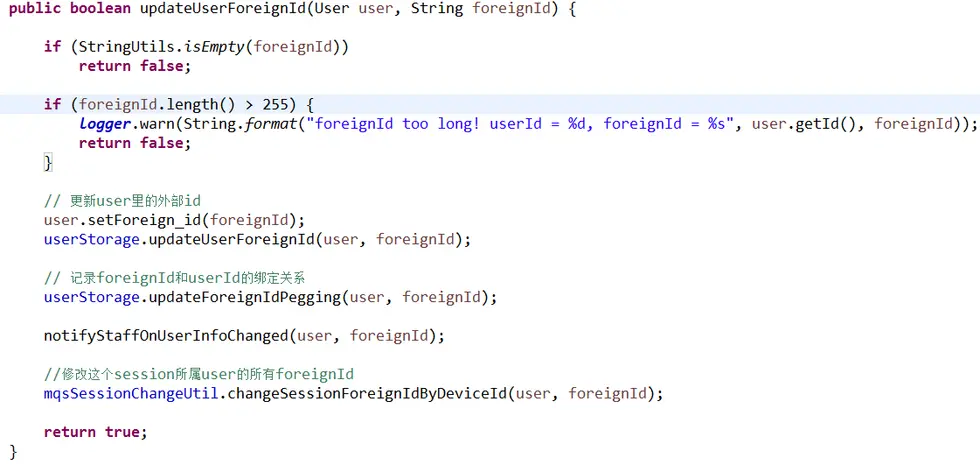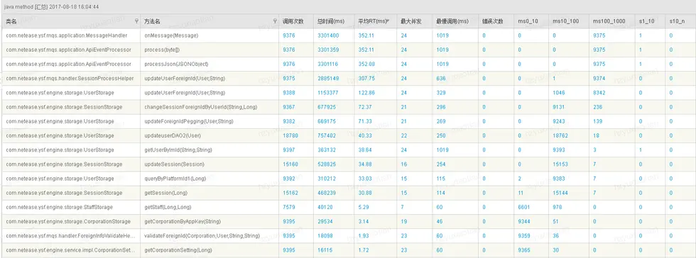 onMessage是该协议的总入口,可以看到该协议平均耗时为352.11ms,观察其他耗时方法可以看到updateUserForeignId耗时307.75ms,那么可以认为该方法的响应时间慢是该协议的最主要性能瓶颈,这时候我们应该看看该方法究竟做了哪些操作导致响应时间过长: