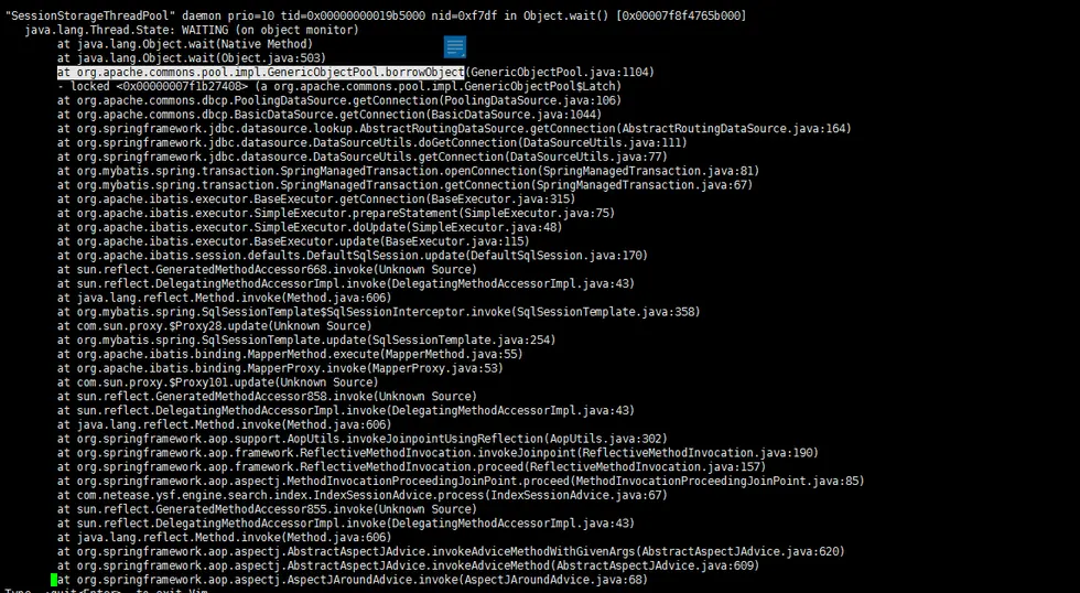 在所有的24个线程中,多执行几次jstack可以发现大约有十个左右的线程处于waitting状态,该状态表明该线程正在执行obj.wait()方法,放弃了 Monitor,进入 “Wait Set”队列,为什么阻塞住呢,继续往下看堆栈信息,可以看到该线程正在做borrowobject操作,可以大概看到这里是一个数据库连接池的相关操作,具体到究竟是干什么的可以查看一些数据库连接池的资料:dbcp源码解读与对象池原理剖析
