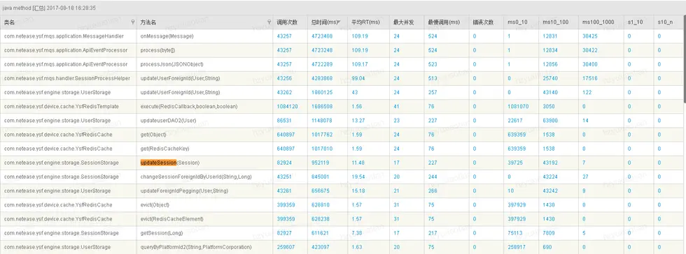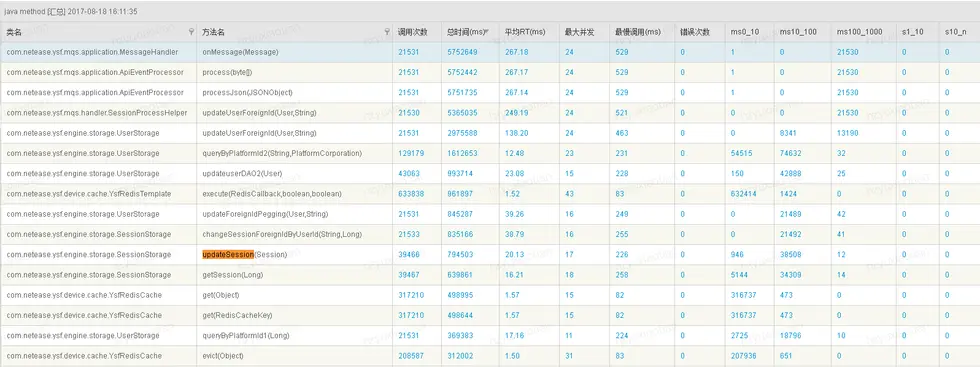 我们从上面可以看出在该方法中有个synchronized同步锁,同步锁就会导致线程竞争,那么在大并发情况下将会出现性能问题,同会引起线程BLOCKED问题。那么如何优化log4j使其执行时间尽量短,防止线程阻塞呢,推荐一下我们组候姐的一篇文章:log4j不同配置对性能的影响 当前我们解决该问题的方式是去掉log4j配置文件中打印行号的选项,然后再执行一轮测试可以看到如下结果: 可以看到响应updateSession响应时间又下降了一半到了11.48ms的水平,优化到这里可以看到该dao层方法算是达到了一个正常水平,看总体的响应时间也从原先的352.11ms下降到109.19ms。可以认为解决了该协议的性能问题。 总结下来,可以发现一个典型性能问题的分析思路:发现性能问题-->查看压测机,服务器,数据库资源指标是否达到瓶颈点-->结合哨兵找到主要耗时方法-->查看耗时方法的具体代码逻辑-->具体问题具体分析(这里是结合jstack查看堆栈信息)-->条件允许范围内优化问题并验证问题。
