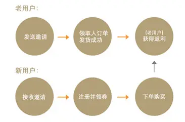 老用户发送邀请—新用户注册并领券—新用户下载app—下单成功—老用户拿返利